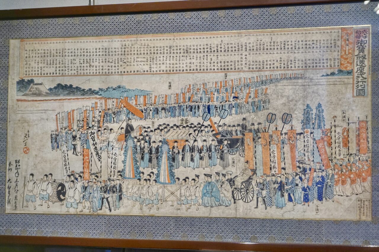200以上の講社講元など大行列の上で御宝剣遷座式が執り行われた。(画像は令和になり崇敬者宅で発見された遷座式の様子を描いた浮世絵)