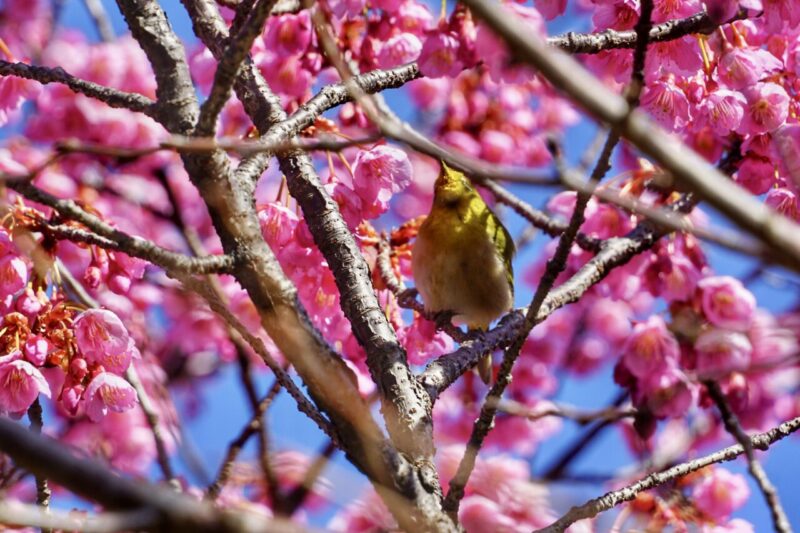 美しい寒緋桜に集まるメジロ。