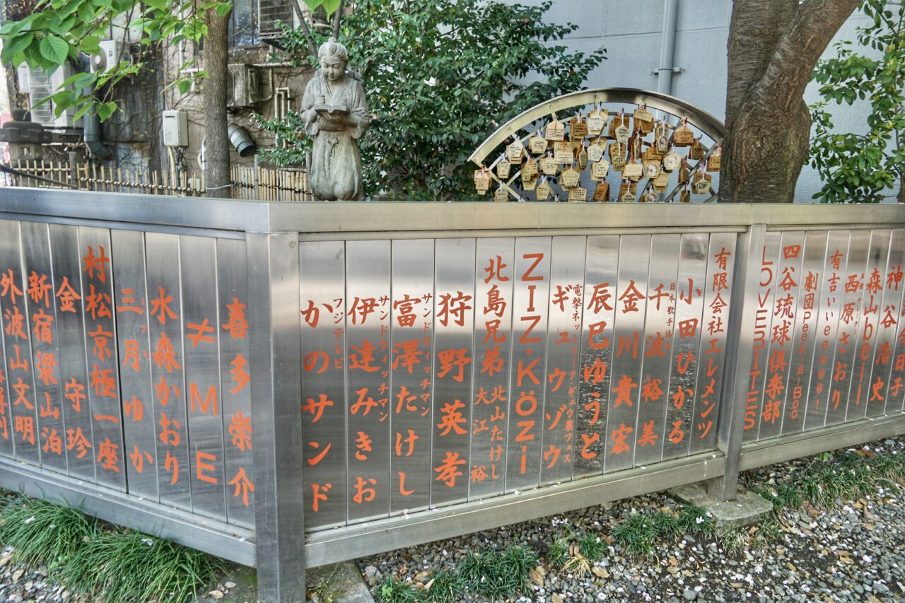社号にも「芸能」の文字が付くため、玉垣にも芸能関係の人物や事務所などの名が並ぶ。