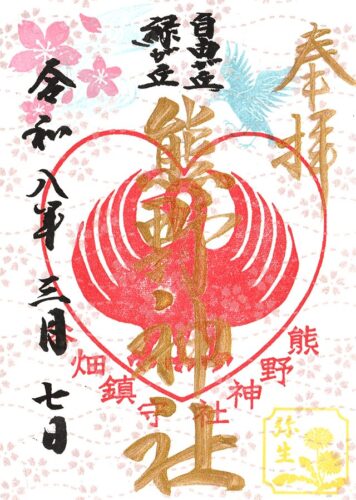 熊野信仰は、平安時代(794-1192年)の中期より盛んになったが、公家勢力が衰え武士階級の時代即ち鎌倉時代(今より約七百九十年前)より、東国の武士、庶民の間に、西方熊野を極楽浄土になぞらえて、参詣が逐次盛んになり、現在の目黒地域からも、那智熊野参詣の記録があり、当神社創設の年月は詳らかではないが、その時代、本宮の神霊を拝受して祀られたものと思われる。(頒布のリーフレットより)