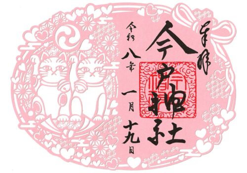縁結びの神社。招き猫発祥の地・招き猫がたくさんいる境内。招き猫の切り絵御朱印。今戸焼による招き猫・丸〆猫。沖田総司終焉の地とその検証。江戸時代に今戸焼職人が奉納の狛犬。源頼義・義家による創建・今戸八幡。江戸時代の再興・今戸の歴史。御朱印帳。