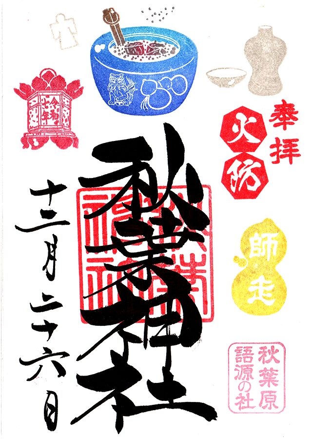 秋葉原の地名由来・東京一円火災鎮護の神社。ひさご(瓢箪)の御朱印・限定御朱印。誕生日や誕生月に頂ける特別御朱印。明治に発生した大火・火災鎮護の鎮火神社を創建。庶民の勘違いによる秋葉様。鎮火祭・火渡式。『シュタインズ・ゲート』舞台。御朱印帳。
