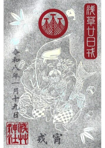 橋場一帯の鎮守・神明さん。摂社・真先稲荷神社。2024年は御鎮座1,300年・限定御朱印も。聖武天皇の勅願で創建・源頼朝の寄進など大社として発展。多くの浮世絵の題材に。二基の石浜鳥居。『剣客商売』の舞台。浅草名所七福神・寿老神。御朱印帳。