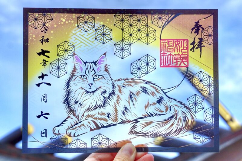 神社で飼育されている神社猫のむぎくんをデザインしたクリア御朱印。