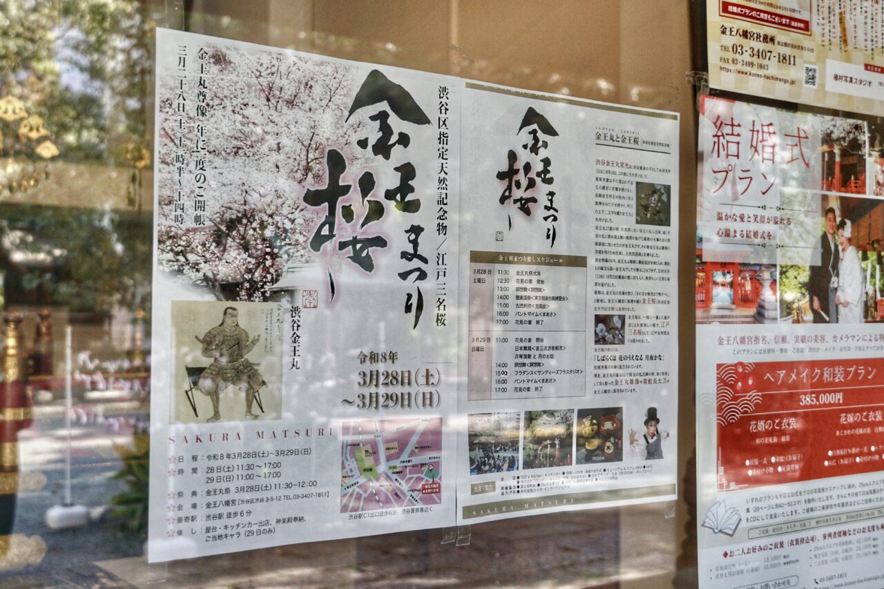 春日局が寄進した社殿が改修されつつ現存している他、古くから江戸三名桜の1つとされた金王桜が境内に残る。
