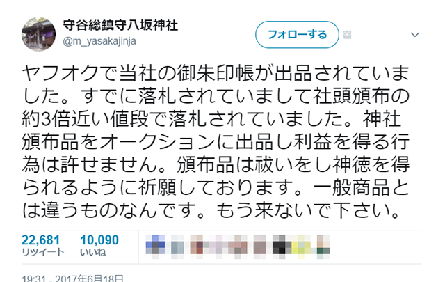 「転売目的の人は来ないで」 『ヤフオク!』御朱印帳出品に対する茨城・八坂神社のツイートにさまざまな意見 - ライブドアニュース
