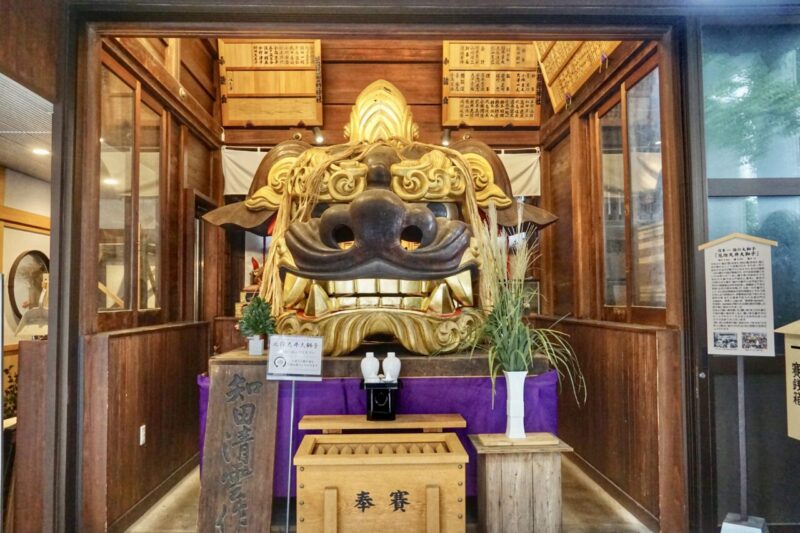 境内に置かれた巨大な獅子頭や、例大祭の「つきじ獅子祭」で知られる。