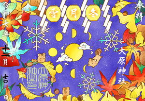 裏面には境内のアカガシとクロマツ、さらに「ご縁結びの大原神社」の文字。