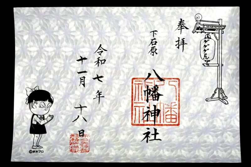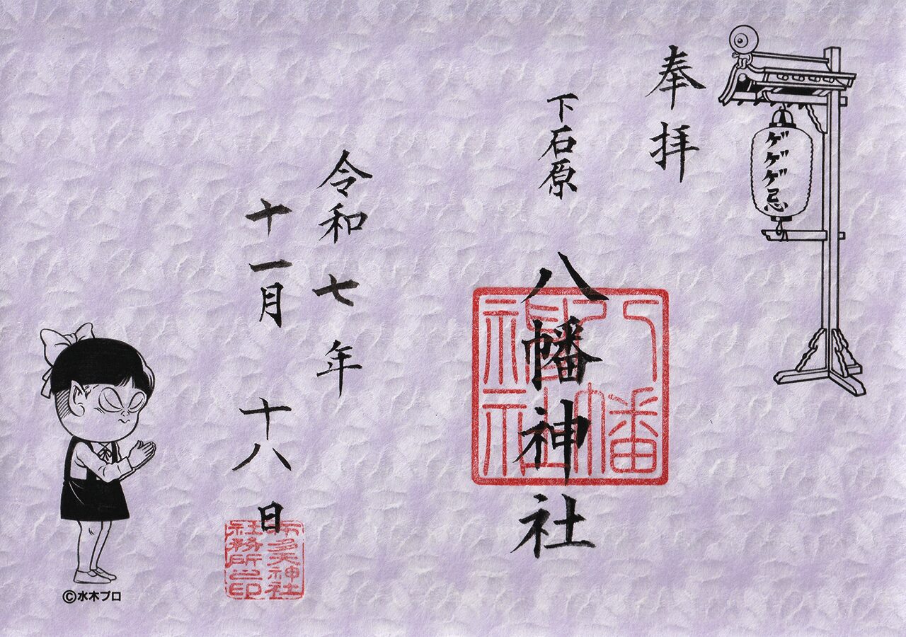 ゲゲゲ忌の期間中は「布多天神社」で限定御朱印を授与。(ゲゲゲ忌2019で頂いた御朱印)猫娘が押印された当社(下石原八幡神社)の限定御朱印で、朱印部分には「八幡神社」の文字、「布多天神社」で頂くため左下には「布多天神社社務所之印」も押印されている。