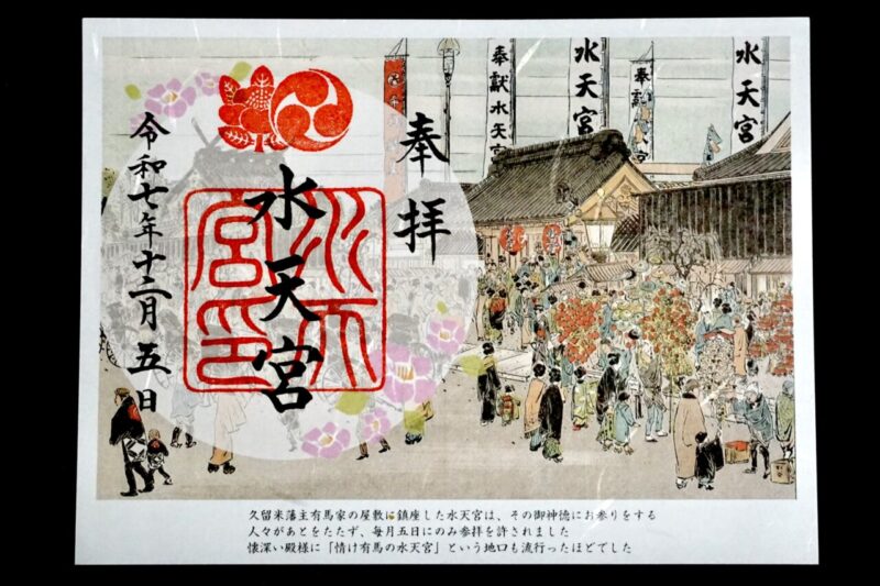 文政元年、久留米藩有馬家上屋敷内に祀られた水天宮は、人々の信仰が篤く、塀越しにお賽銭を投げる人が後を絶たちませんでした。時の藩主は毎月五日に限り、お屋敷の門を開き、人々のお参りを許しました。