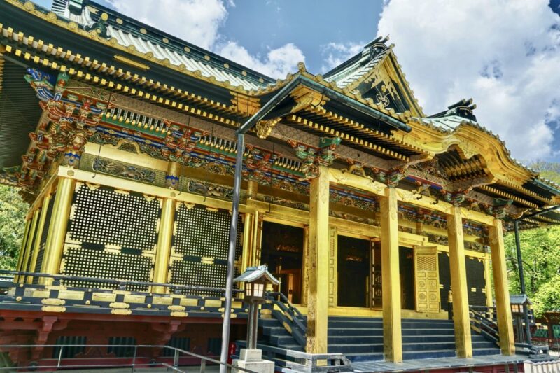 上野公園内に鎮座。重要文化財の社殿(金色殿)・唐門・透塀・銅燈籠。左甚五郎の龍の彫刻。金色殿開扉。夢叶う光の夜・ライトアップイベント。切り絵御朱印。月替り御朱印。徳川家康の遺言・天海と藤堂高虎により創建。ぼたん苑。栄誉権現社。御朱印帳。