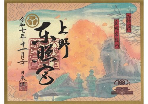 新幹線と当宮の唐門や金色殿をデザインした紅葉仕様の御朱印。